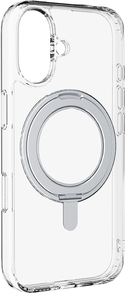 SPIN MAG ist die transparente Hülle mit drehbarem Ständer, die mit dem MagSafe-System kompatibel ist. Es zeichnet sich durch einen um 360 Grad drehbaren Ring aus, der es dem Gehäuse ermöglicht, verschiedene Funktionen wie Stand- und Halterungsfunktionen zu übernehmen. Der Ring ist integriert und wird bei Nichtgebrauch zu einem integralen Bestandteil des Gehäuses, sodass es mit MagSafe-Zubehör kompatibel ist. Die erhöhten Kanten rund um das Display und die Kamerabereiche schützen das Telefon vor versehentlichen Stößen und Stürzen.